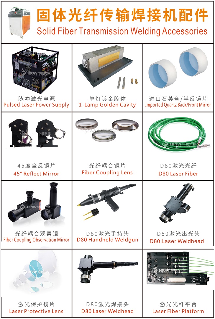 Solid fiber transmission laser welding spares and consumables -Pulsed laser power supply -Golden cavity -Quartz front and rear mirror (Imported material) -45 degrees complete reflecting mirror -Fiber coupling lens -D80 laser energy fiber -F...